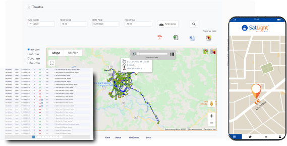 Relatórios diários de posicionamento via GPS e GPRS informando a localização Km/H voltagem da bateria, hodômetro, Horímetro, podendo ser exportados em PDF ou via aplicativo móvel. Saiba onde estão os seus carros a todo momento e acompanhe as rotas.